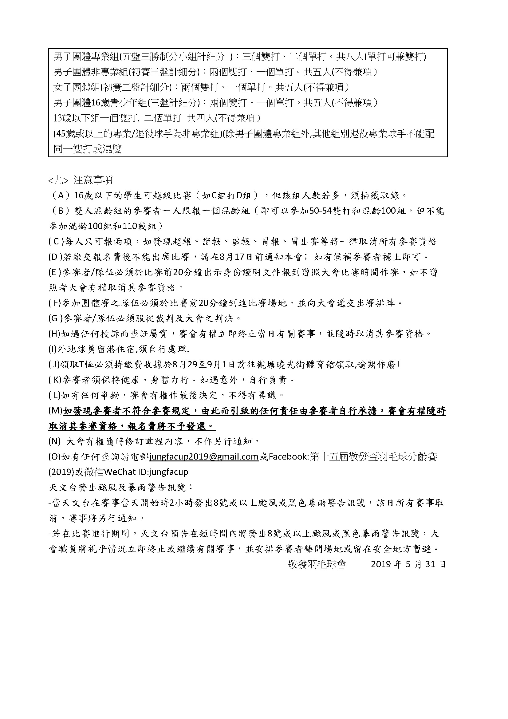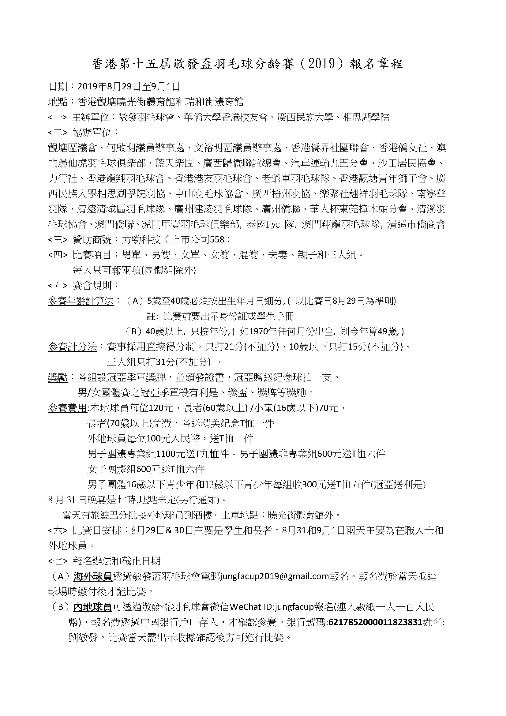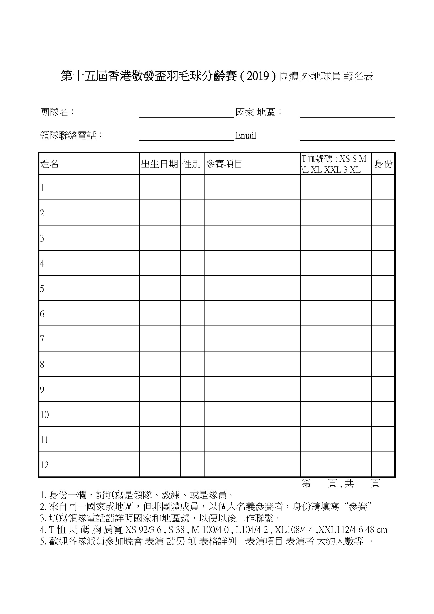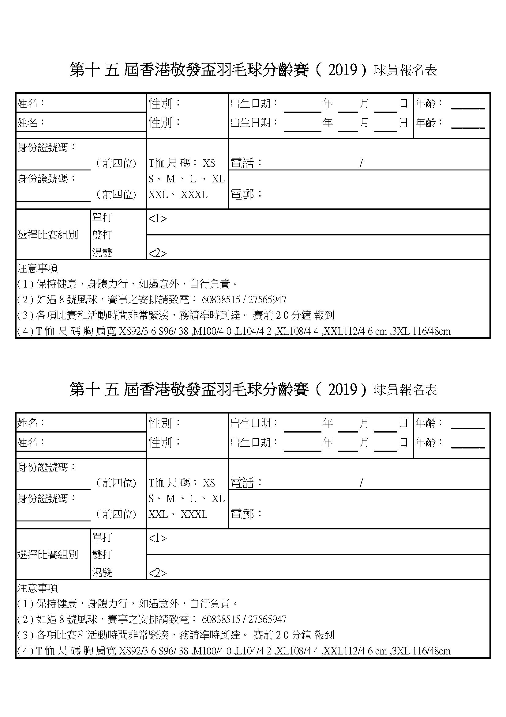 香港球員表明表:http://www.hqu.org.hk/wp-content/uploads/2019/06/敬发杯羽毛球分龄赛2019(香港球员报名表).pdf