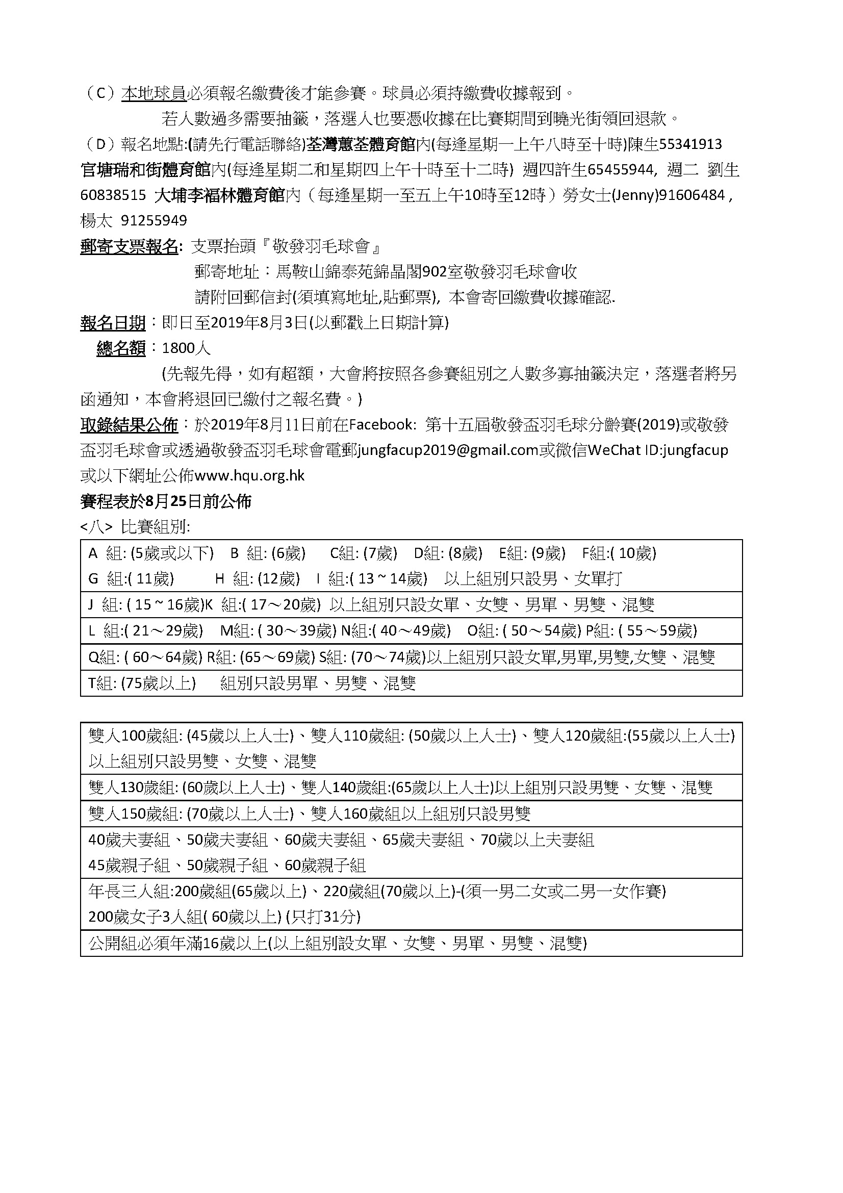團體外地球員報名表鏈接:http://www.hqu.org.hk/wp-content/uploads/2019/06/敬發盃羽毛球分齡賽2019(團體外地球員報名表).pdf