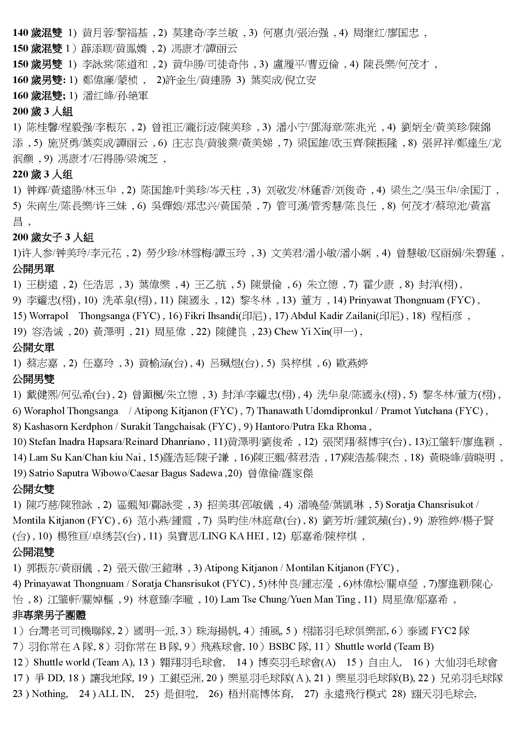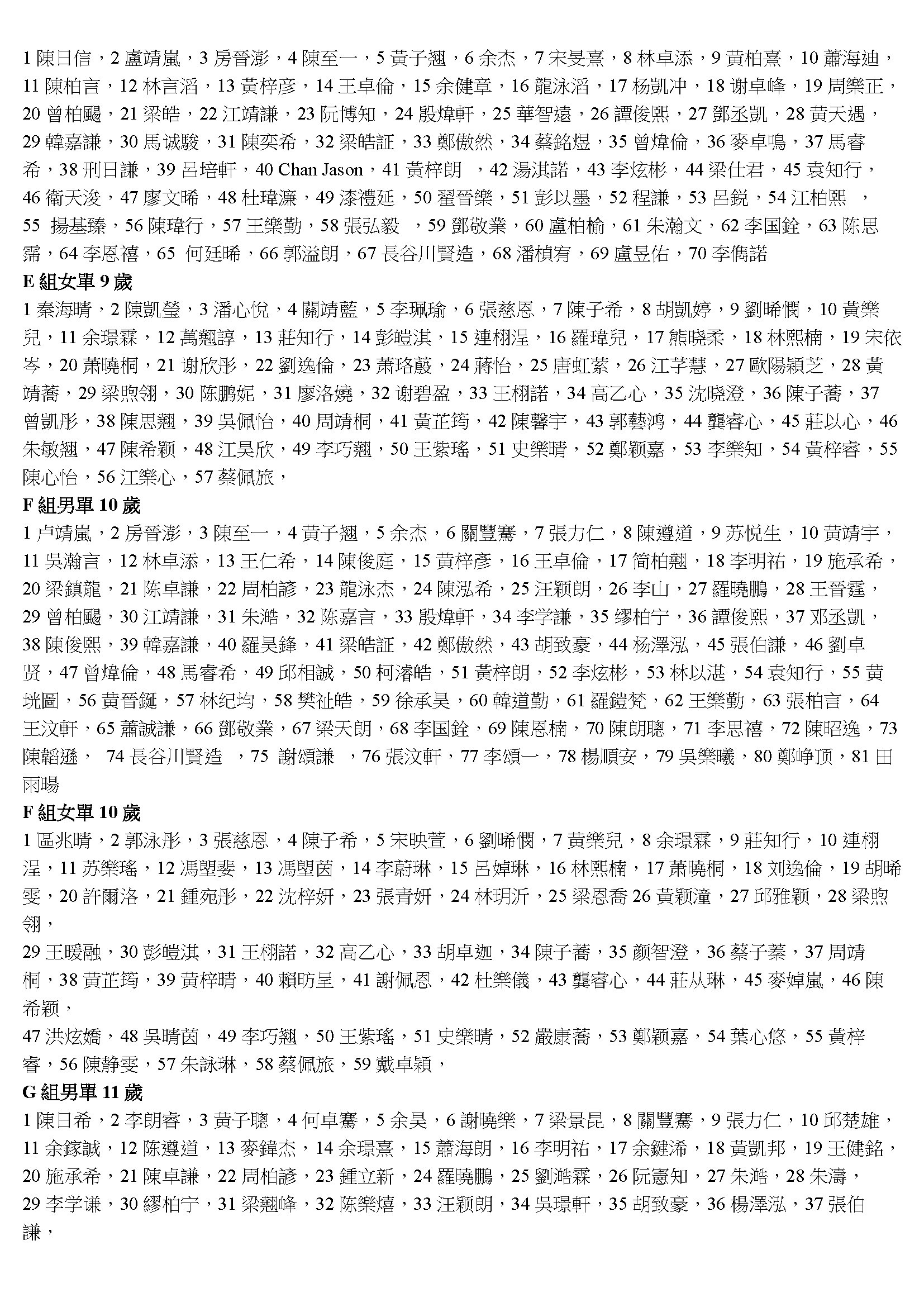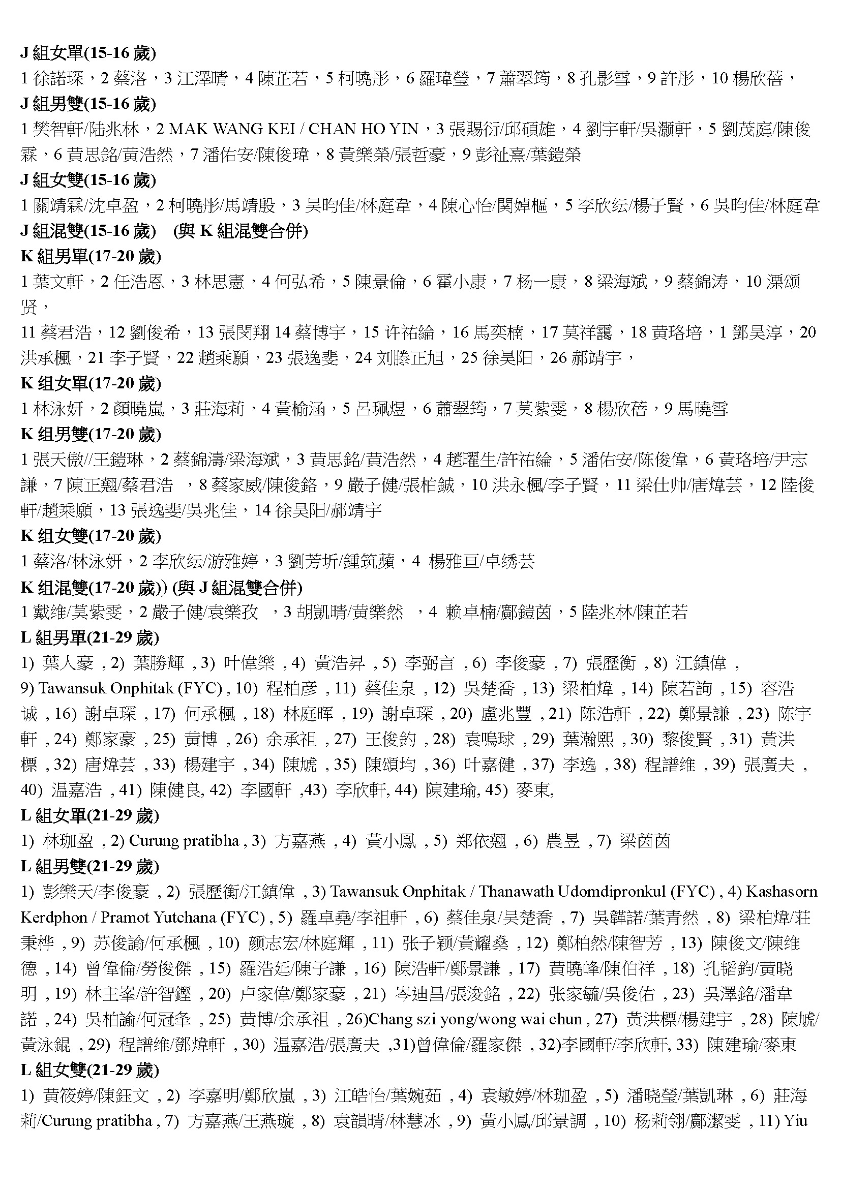 2019香港第十五屆敬發杯羽毛球分齡賽錄取名單