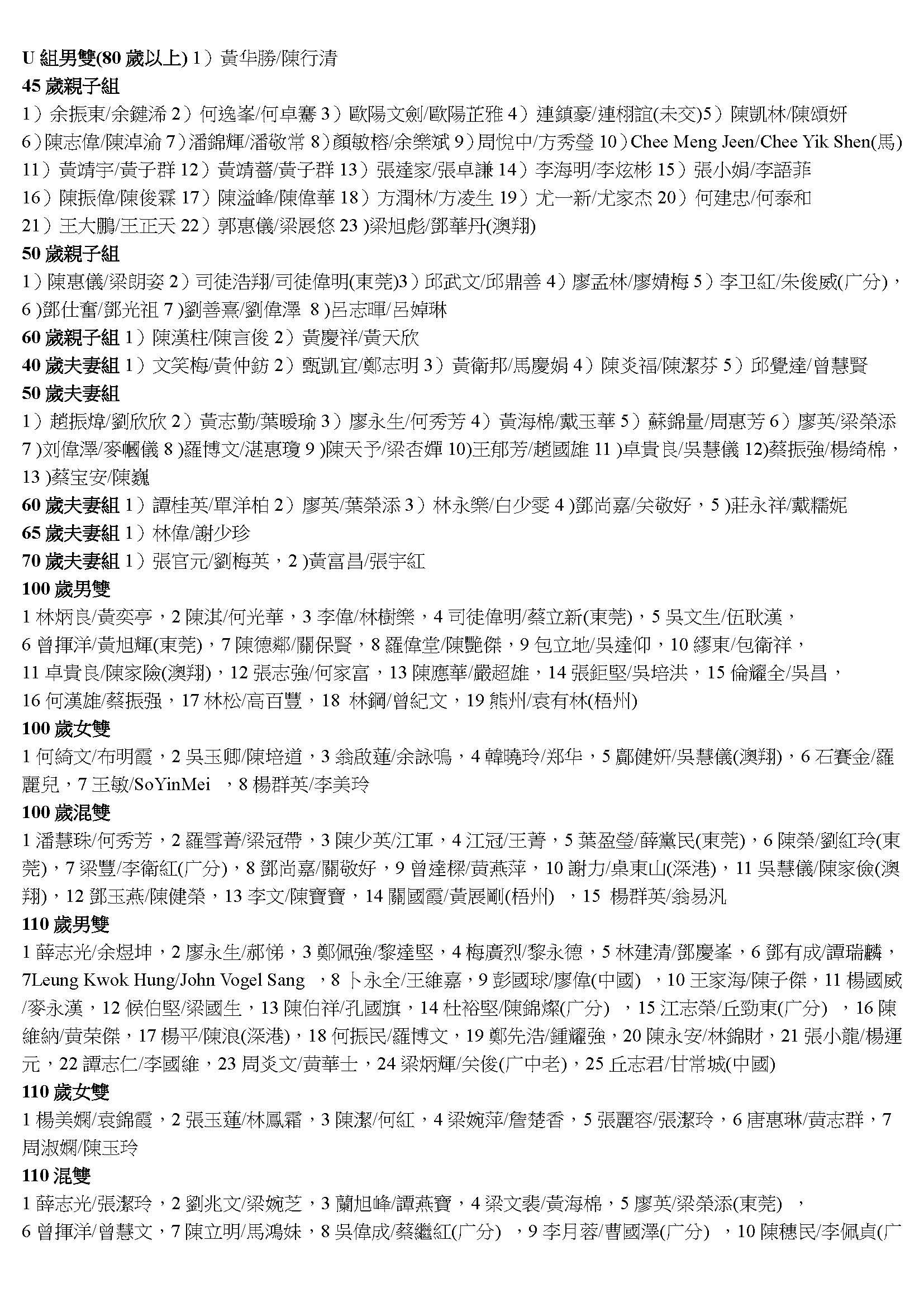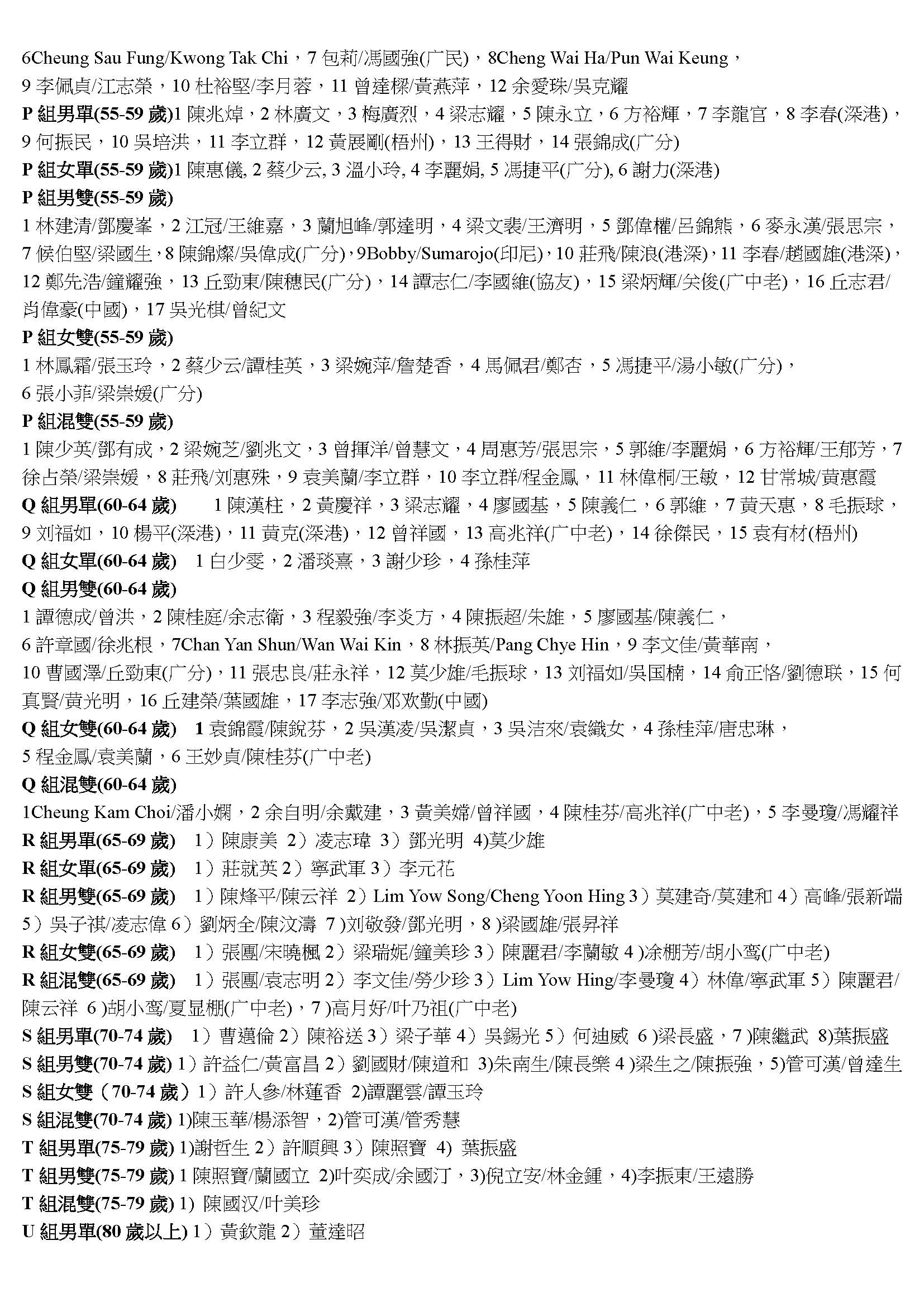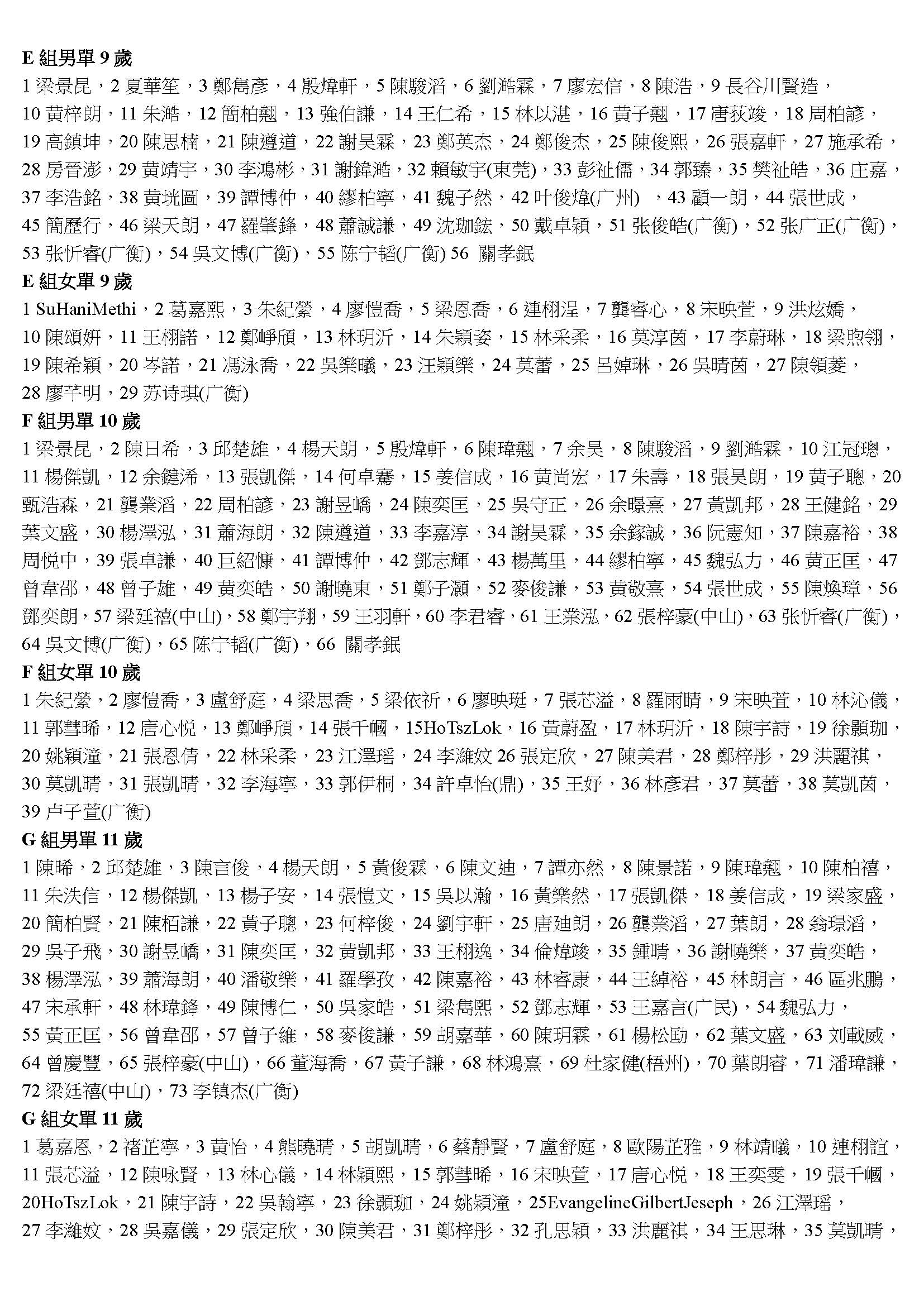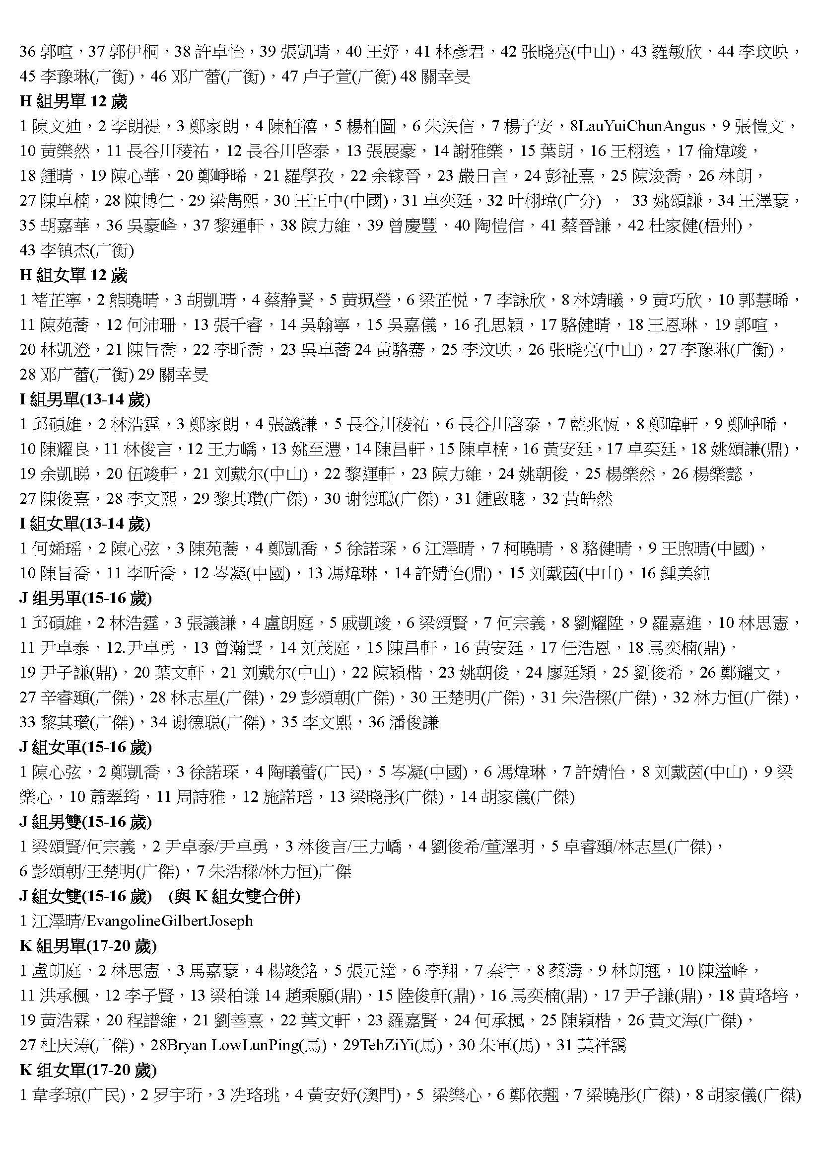 2018第十四屆香港敬發杯羽毛球分齡賽錄取名單